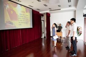 頒獎結(jié)束進入黨員重溫入黨誓詞環(huán)節(jié),朱書記在臺前領(lǐng)誓,新黨員張哨駿、王宇上臺宣誓,全體黨員起立,面向黨旗重溫入黨誓詞。
